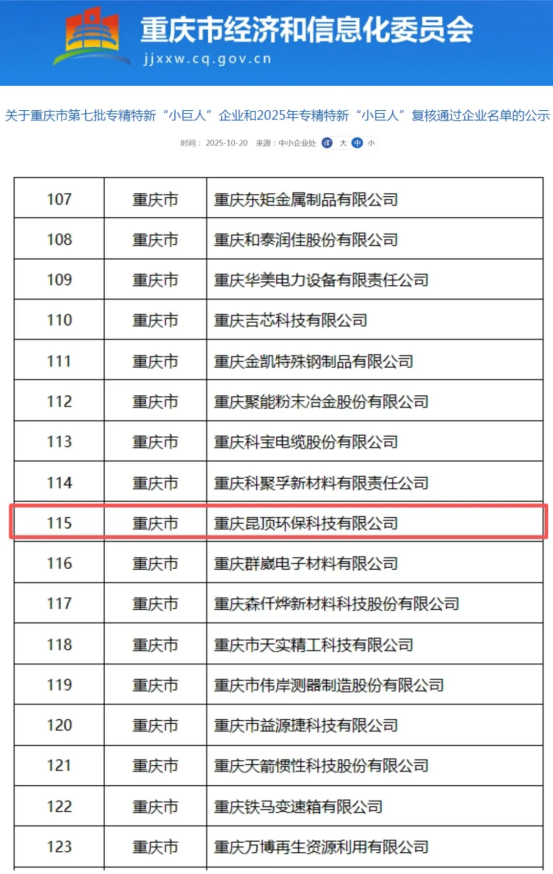 喜訊!近日,國(guó)家工業(yè)和信息化部專精特新“小巨人”企業(yè)復(fù)核結(jié)果正式揭曉——昆頂環(huán)保再獲國(guó)家工信部專精特新“小巨人”復(fù)核認(rèn)證,蟬聯(lián)中小企業(yè)最高榮譽(yù),穩(wěn)居環(huán)保科技領(lǐng)域“領(lǐng)頭雁”。